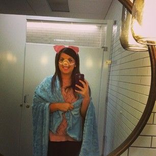 This sounds so much more difficult than it is! just find your favorite blanket (or large scarf) - make some cute pink pig ears, tape on a pink nose, and you're done! Plus this will keep you warm in your office that's probably always too cold!
