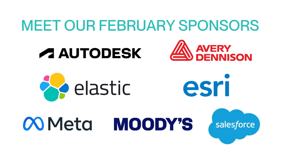 We want to thank our amazing sponsors including Autodesk, Avery Dennison, Elastic, Esri, Meta, Moody’s, and Salesforce for their support and insights.