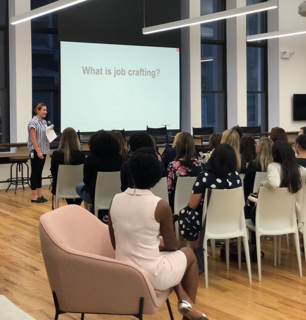 Before the night moved back into networking, our guests received a special treat. Using their gifted Flexport notebooks and pens, Program Manager Bri Lopez walked our attendees through an insightful activity about "crafting your job", geared at identifying the tasks (and teammates) that both give and detract from your work energy. (By the way, if you'd like a copy of Bri's presentation, please email events@powertofly.com)