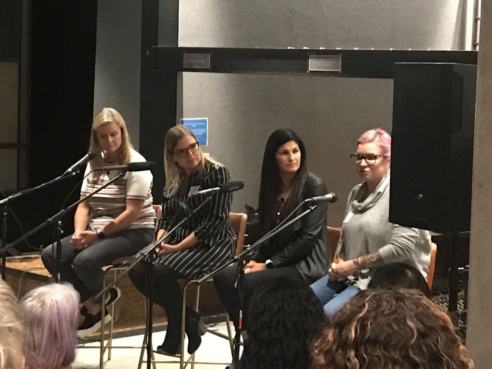 Next, Caroline invited three other women leaders from Microsoft to join Charlotte in a panel discussion including Angie Anderson, Director of Software Engineering; Natalia Mackevicius, Director Program Management; and Ashley McNamara, Principal Cloud Developer Advocate. Our four women leaders in tech dove a bit deeper into their current and past projects, the thriving company culture at Microsoft and how they all find work-life integration. After some questions from Caroline, the floor was opened up for an audience Q&A.