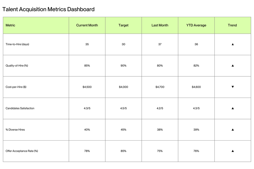 Data-driven hiring is a great way to optimize your talent acquisition strategy. Software tools like dashboards with clear metrics and tracking can help you understand key performance indicators (KPIs) such as time-to-hire, cost-per-hire, and quality-of-hire.
