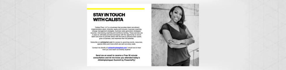 Calista Phair, LLC is a business that provides talent recruitment implementation plans, diversity, equity and inclusion, business coaching, change management strategies, business sales generation strategies, and workforce training. These services are in place to ultimately provide businesses with the opportunity to recruit talent and more so provide others with the tools to advance their career, grow a business, and maximize their full potential.