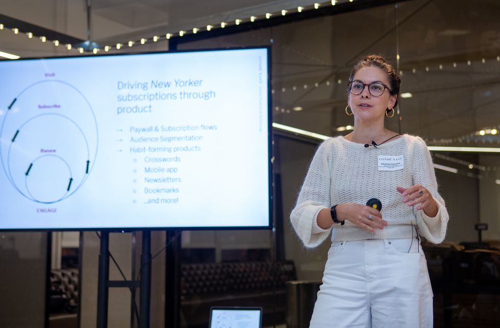 Condé Nast's Chelsea Farnam delivers the night's tech talk.