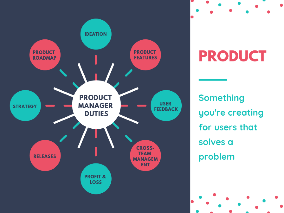 High level, a product manager deals with the entire product lifecycle, from ideation to marketing and sales. The product manager is responsible for big-picture strategy: why do users need this product? what's the vision? what features will it offer? what benefits will it provide its users?