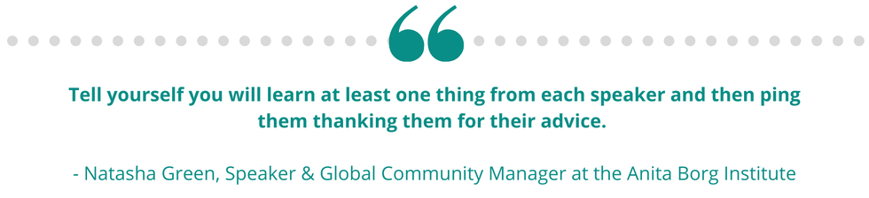 Follow through. "Tell yourself you will learn at least one thing from each speaker and then ping them thanking them for their advice. Speakers always wonder did we help someone today, this hour or this minute," says Natasha Green, Global Community Manager at the Anita Borg Institute and featured speaker on the Diversity Reboot's "Networking While Social Distancing" panel discussion. Keep that in mind especially if you attend her talk!