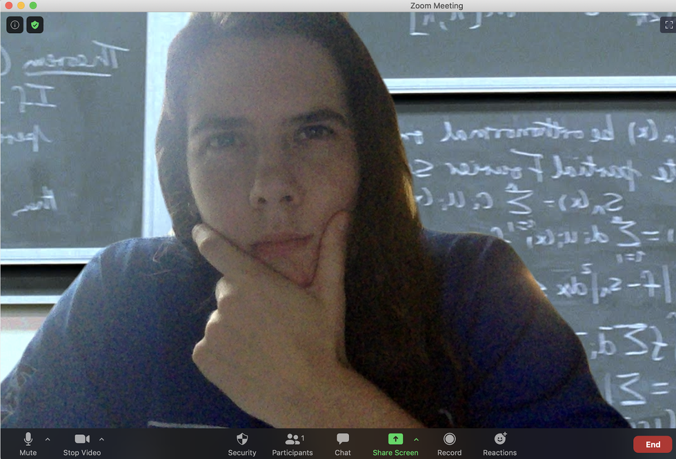 If you don't have any suitable props at your disposal, do not despair: download some screenshots of Sheldon's apartment from Big Bang Theory or the chalkboard in Good Will Hunting and use those as a virtual background.