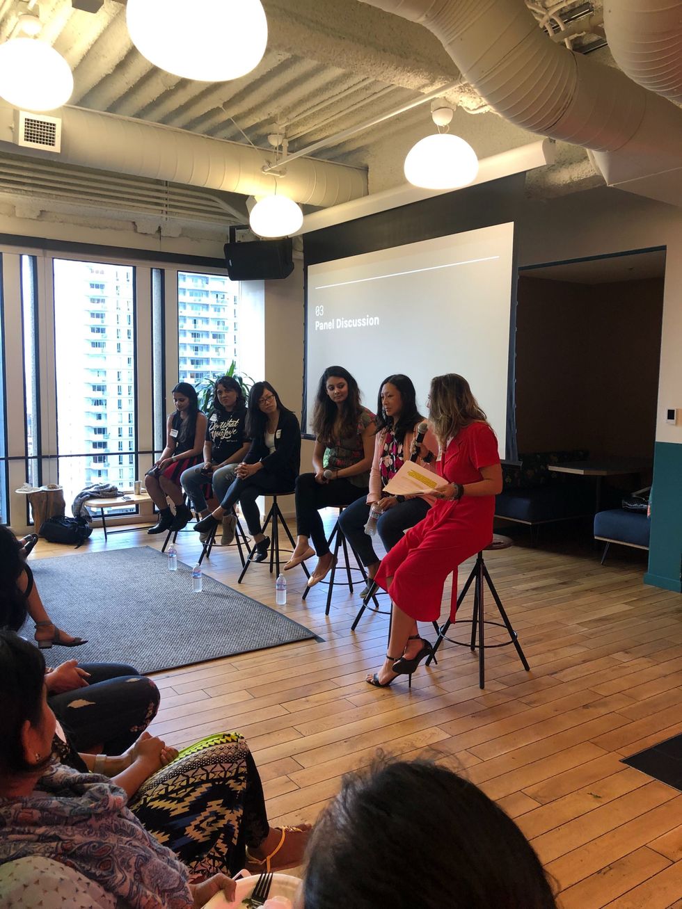 The centerpiece of the evening was then an honest and organic panel discussion featuring several of WeWork's women leaders including Thushara Paul, Senior Manager Engineering; Ramya Amancharla, Director of Product; Sri Modukuru, Senior Manager Engineering; Jiaona Zhang, Director of Product; and Mimi Hui, Senior Director, Product. Following a few discussion topics from Jamie, we opened the floor to questions from the audience.