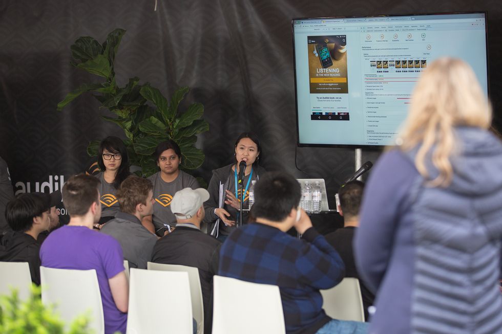 Audible's tent was fashioned into a swanky living room, with couches and a huge fuzzy carpet, a perfect invitation for attendees to come listen to five software developers from Audible's Consumer Domains, the full-stack engineering teams behind Audible's website.