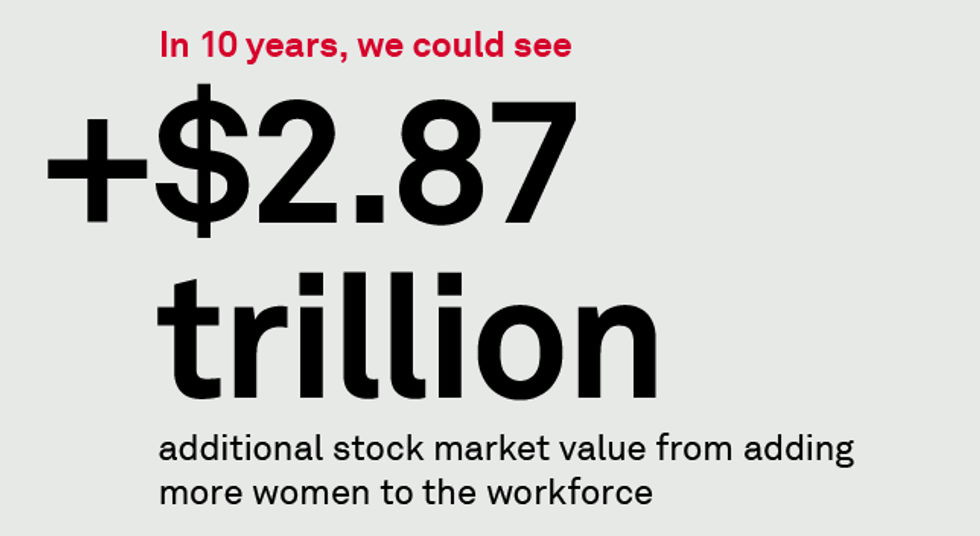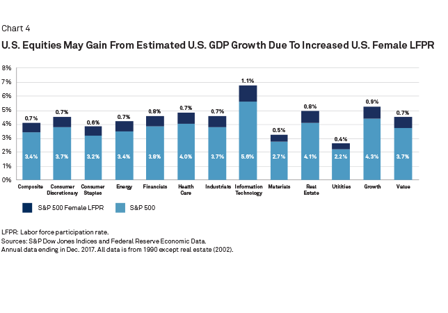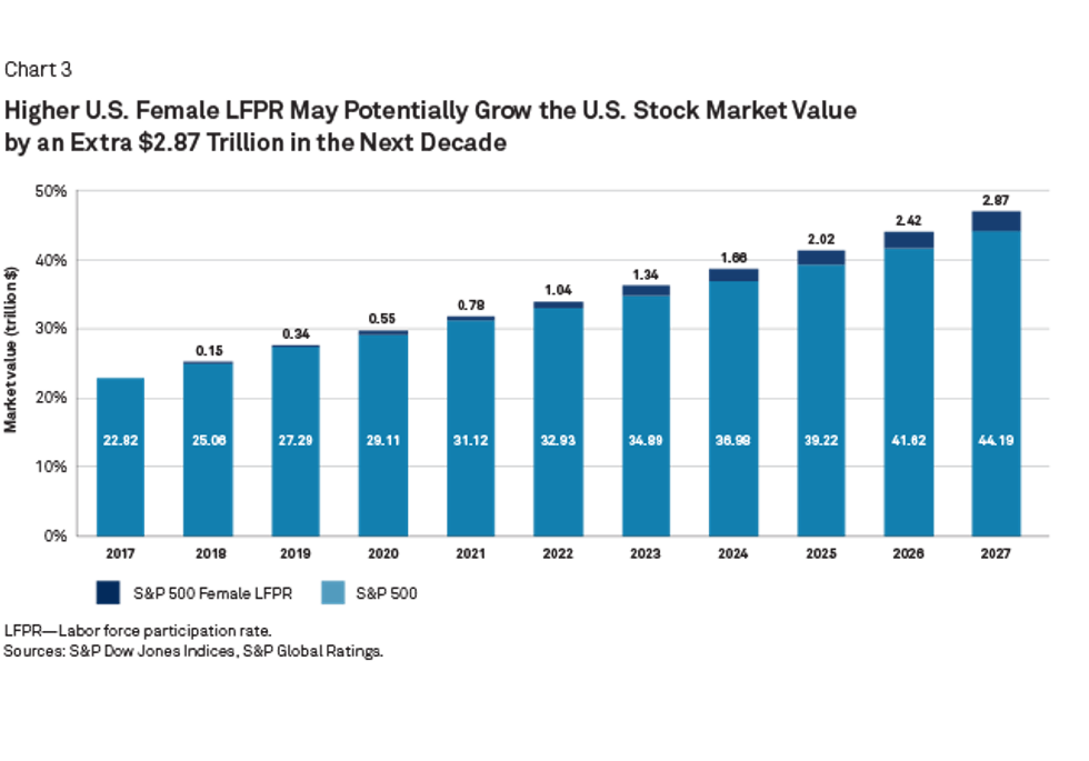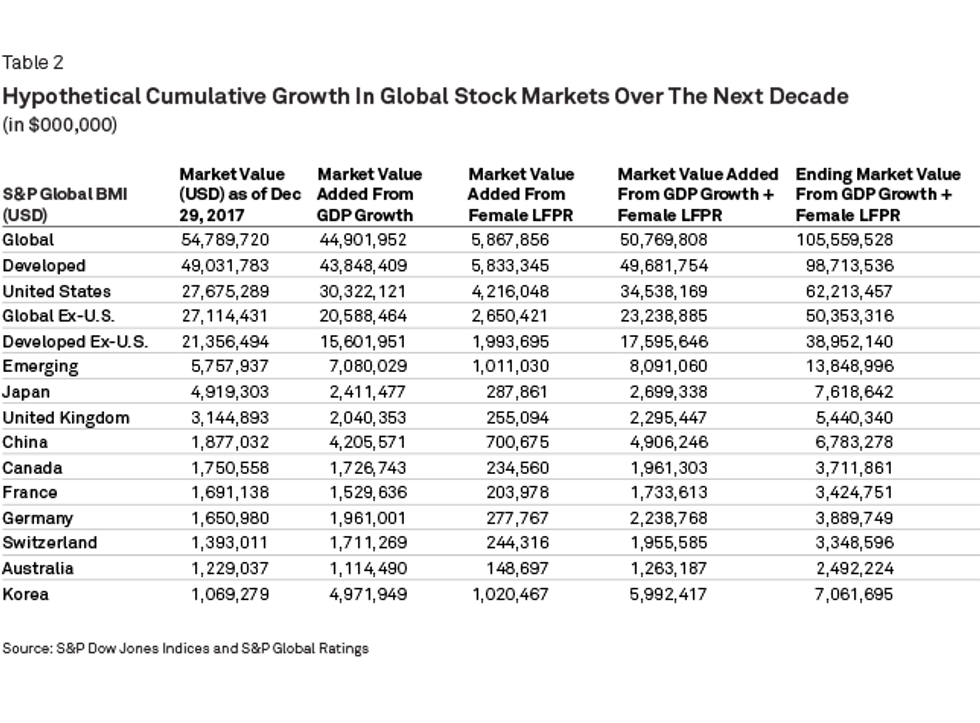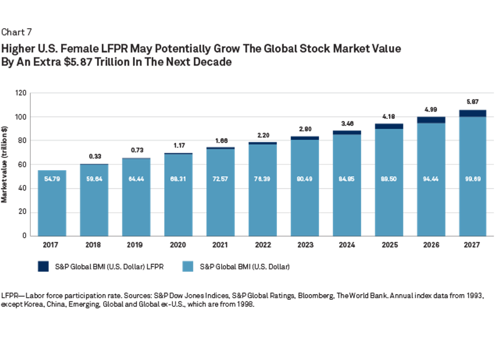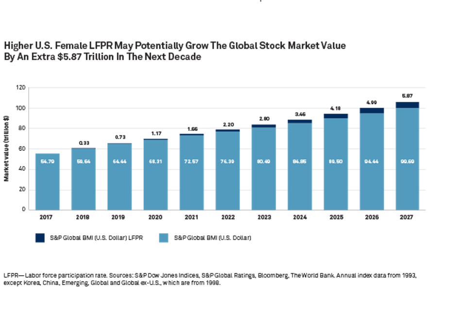 - Acceleration in U.S. GDP growth under increased female labor force participation could add a whopping $5.87 trillion to global market capitalization in 10 years.