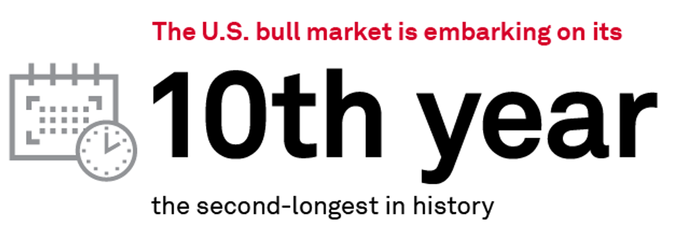 One way to measure the sensitivity of stocks to U.S. GDP growth is by using the "up-market capture ratio," which gauges the average historical annual stock market return per 1% of growth, and shows substantial gains from even a modest acceleration in the U.S. economic expansion. With the U.S. bull market embarking on its 10th year—and now the second-longest in history, just three months shy of the October 1990-March 2000 stretch (see Table 1)—an extra jolt could comfort those investors who are on the lookout for bearish signals.