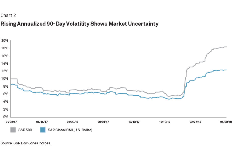 Fear of recession is difficult to measure, but there has been a dramatic increase in stock market volatility, reflecting uncertainty—or higher risk. The current annualized 90-day volatility of the S&P 500 is 18.4%, and it's 12.4% for S&P Global BMI (see Chart 2). That's a respective 1.8 and 1.5 times higher than the levels at President Trump's inauguration. Current volatility is also 3.4 (U.S.) and 2.6 (global) times higher than the lows at the end of 2017.