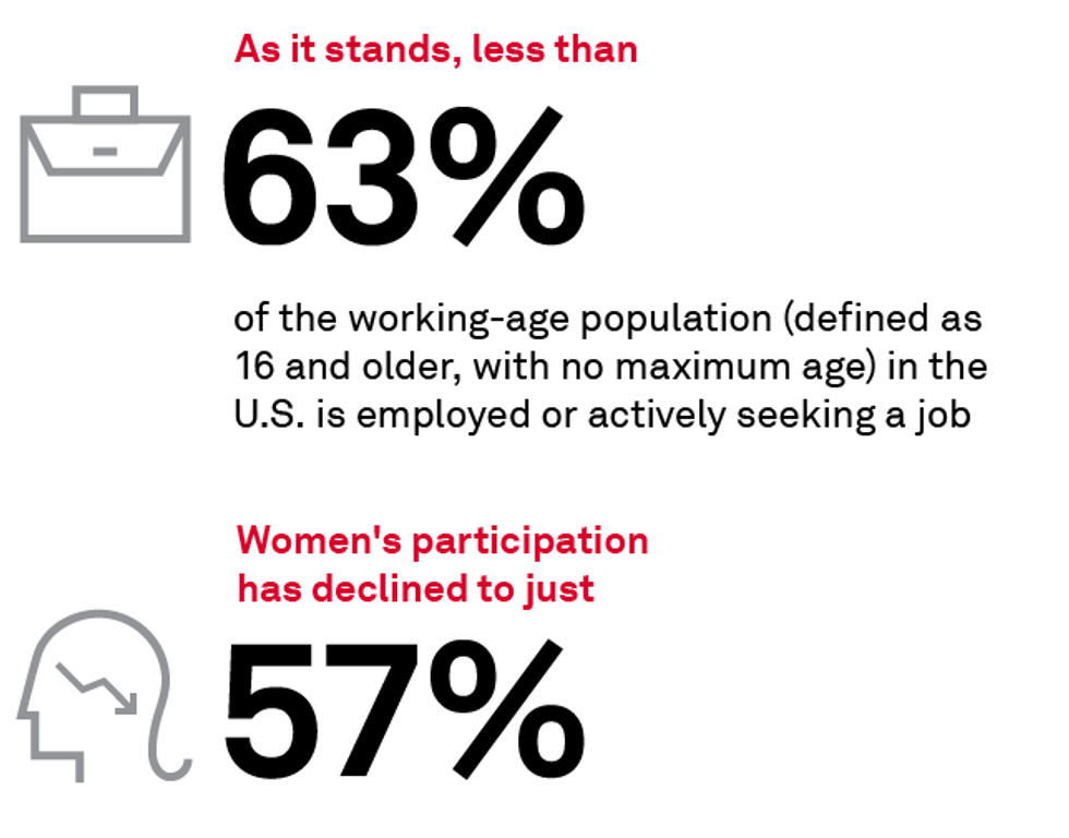 As it stands, less than 63% of the working-age population (defined as 16 and older, with no maximum age) in the U.S. is employed or actively seeking a job—hovering near the lowest level in more than four decades. For years, the surge of women entering the workforce largely offset the slow attrition of male labor force participation. But since the turn of the millennium, women's participation has also declined, to just 57%, from roughly 60% in 2000, according to the Bureau of Labor Statistics.