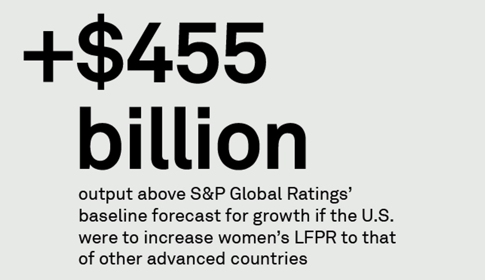 - An increase in women's participation to that of other advanced countries would add an average of 0.2 percentage point annually to U.S. GDP in the coming decade—or a cumulative $455 billion in output above S&P Global's baseline forecast.