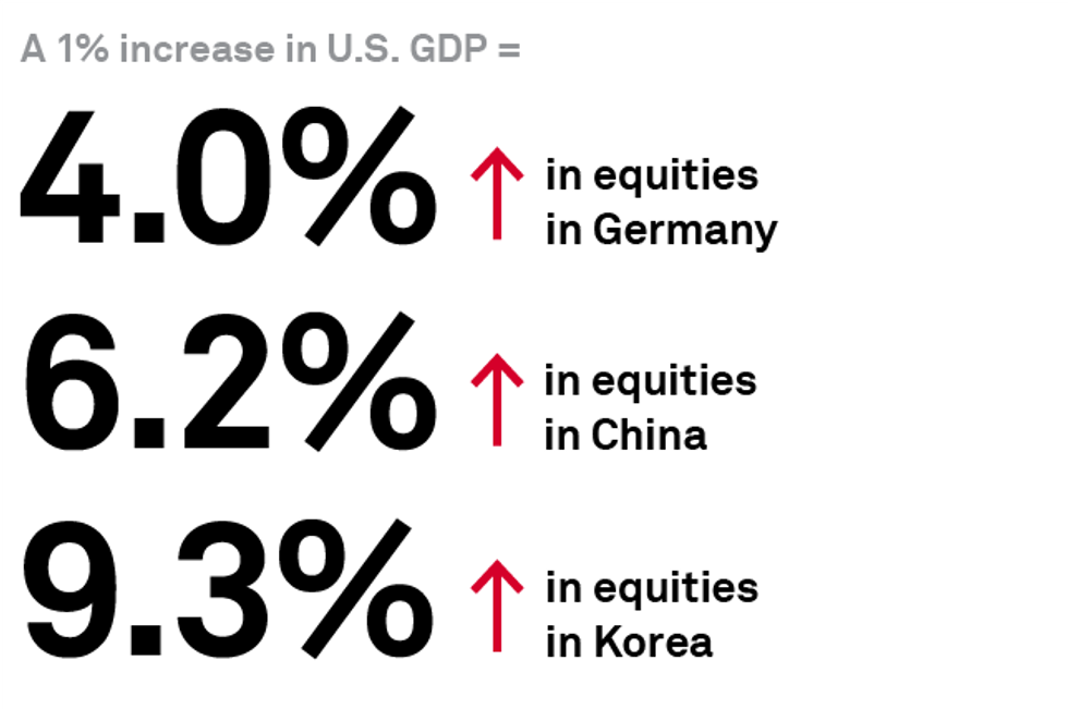 - Around the world, each additional percentage point of U.S. GDP growth has also translated into a 4% jump in equities in Germany, 6.2% in China, and a whopping 9.3% in Korea—even more than the gains we can expect in the U.S. itself.
