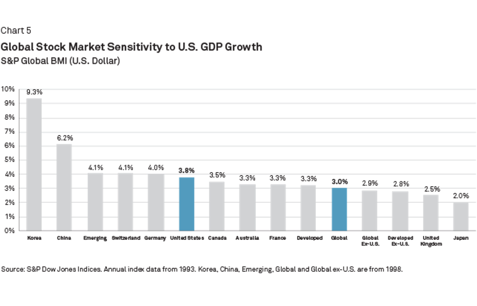 S&P Dow Jones Indices calculates that, for example, each additional percentage point of U.S. GDP growth has translated to a 4% jump in equities in Germany, 6.2% in China, and a whopping 9.3% in Korea—even more than the gains we can expect in the U.S. itself (see Chart 5).