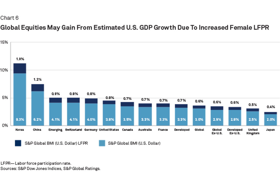 When we add in the boost to U.S. GDP of increased women's LFPR, the numbers become even more impressive. Equities in Korea would enjoy an additional 1.9% bump, and those in China would gain another 1.2% (see Chart 6).